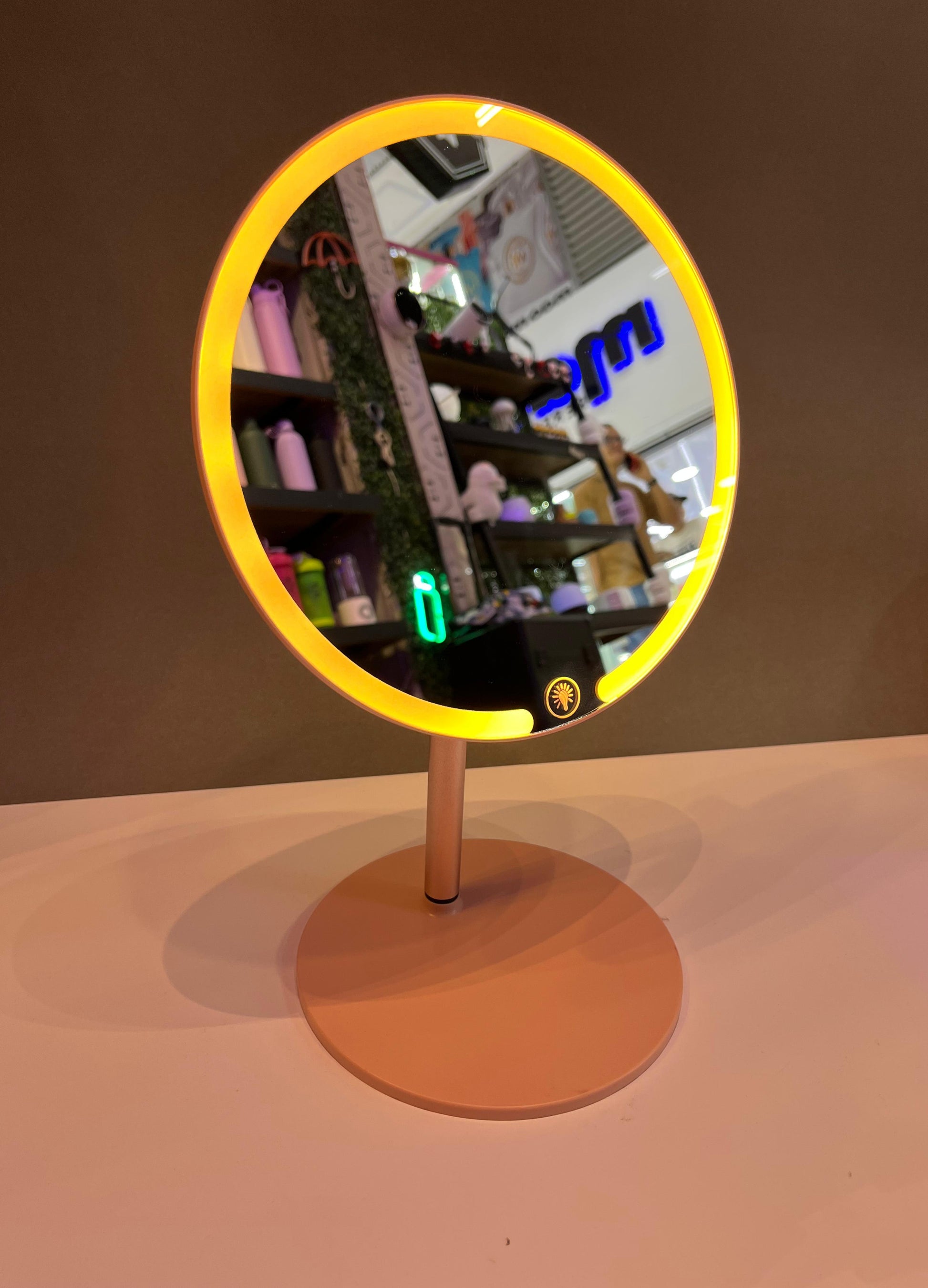 Dale un toque moderno a tu rutina de belleza con este espejo de maquillaje LED redondo, perfecto para tu tocador o escritorio. Su diseño elegante con base estable lo convierte en un accesorio práctico y decorativo.