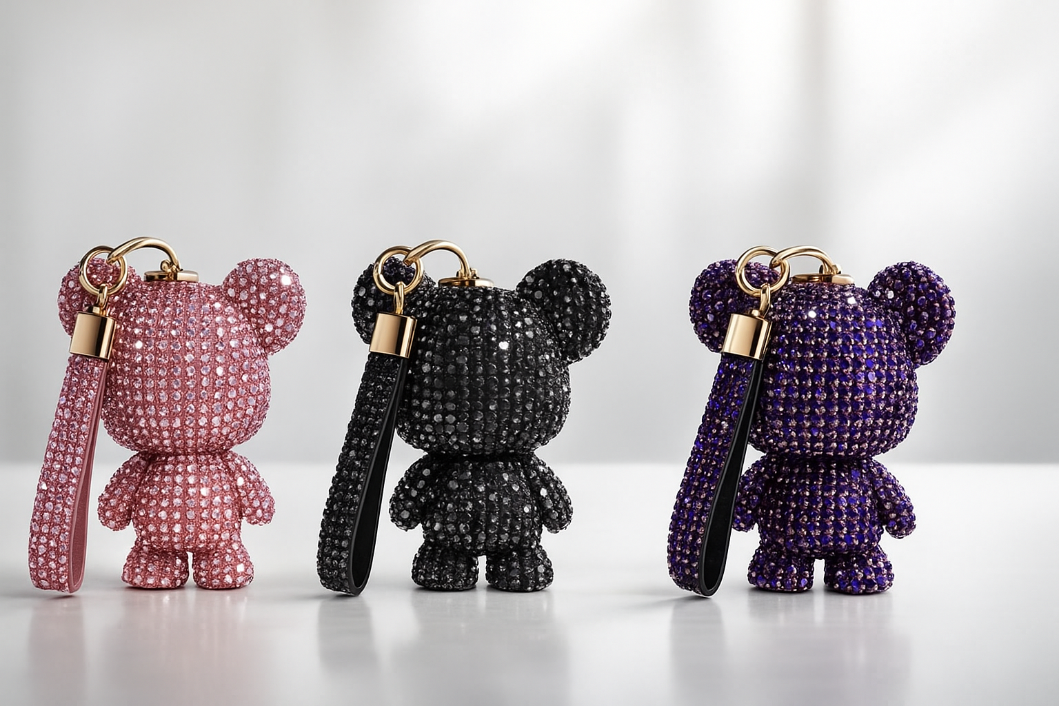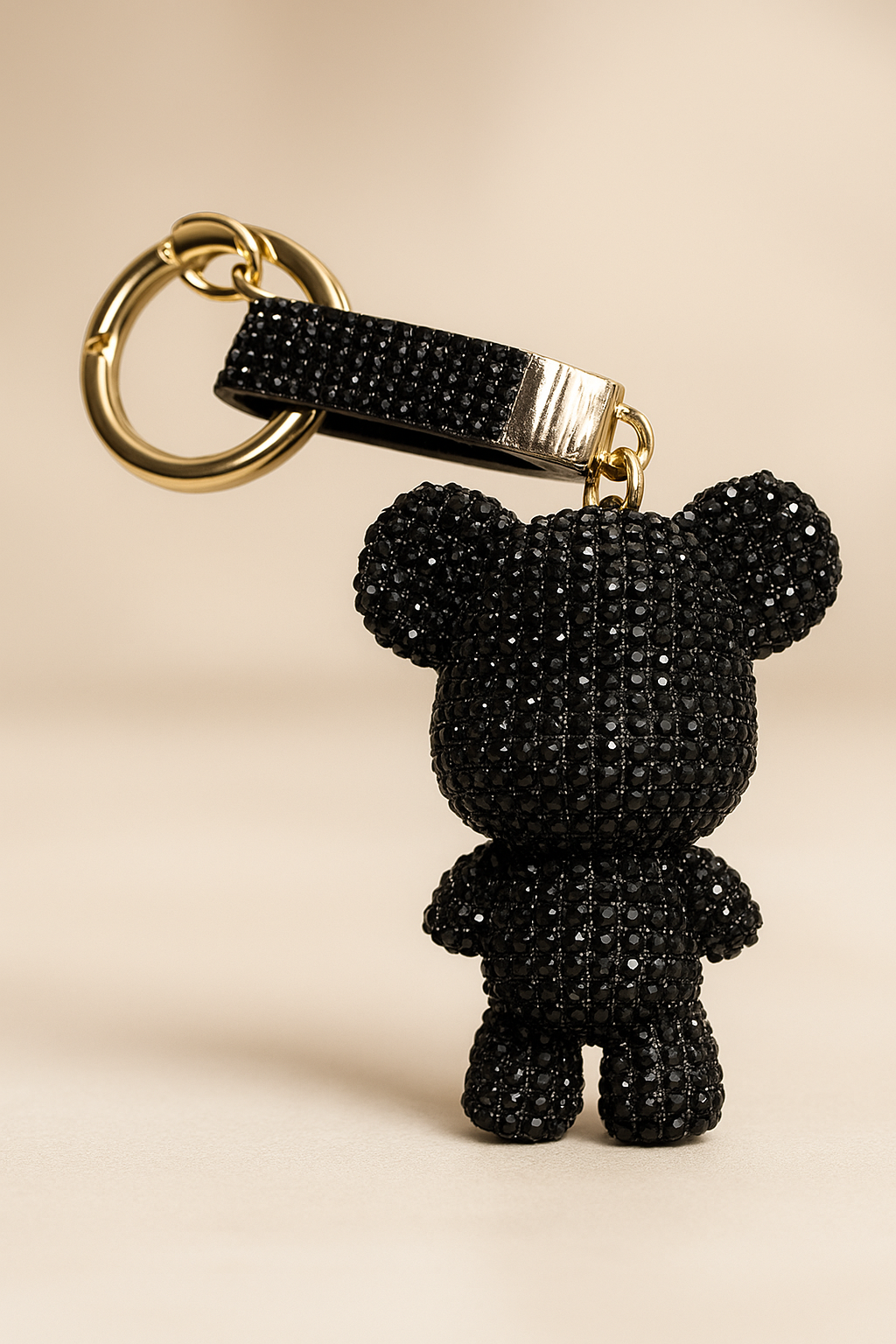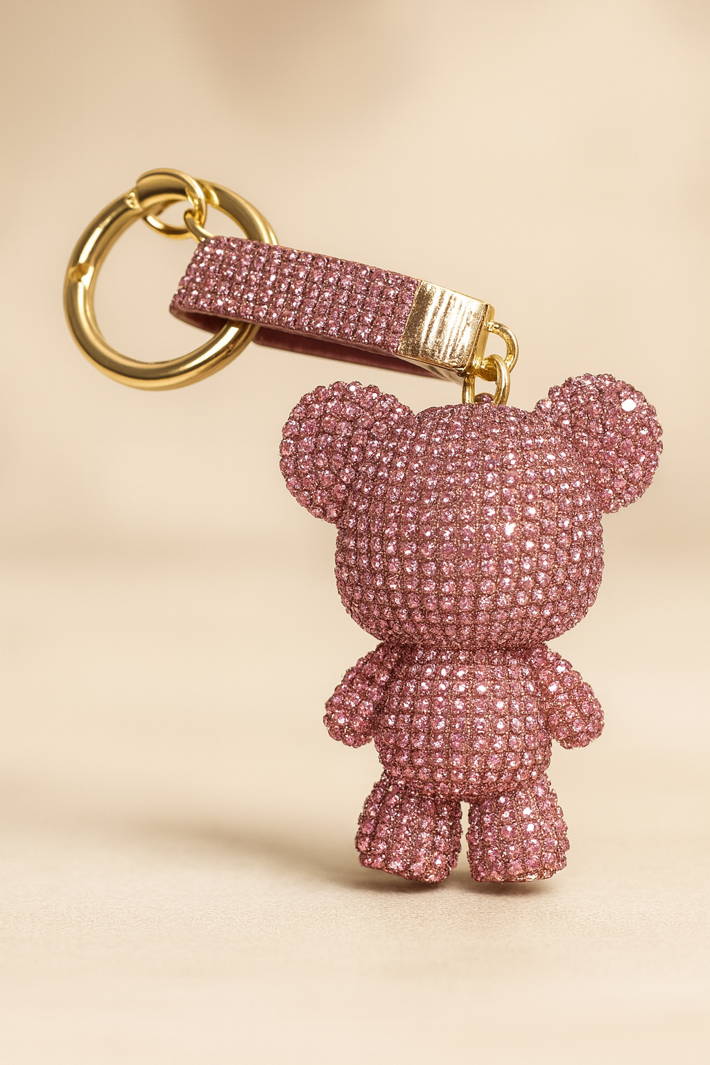 Un llavero elegante y lleno de brillo. Su osito en cristales resalta con un acabado brillante y sofisticado, ideal para darle un toque de lujo a tus llaves o bolso. Acompañado de herrajes dorados y una correa a juego, es resistente, llamativo y perfecto para regalar.