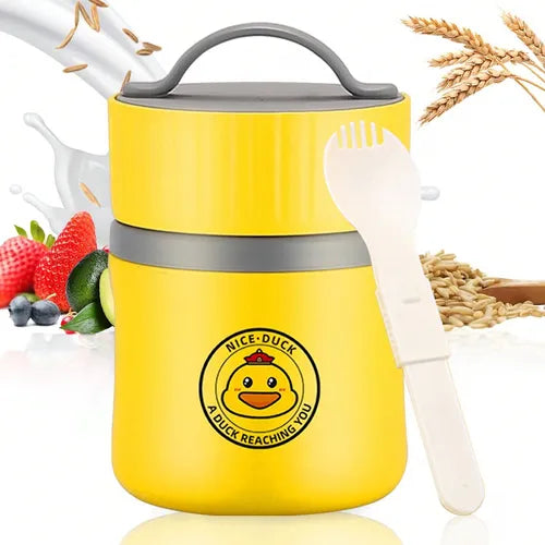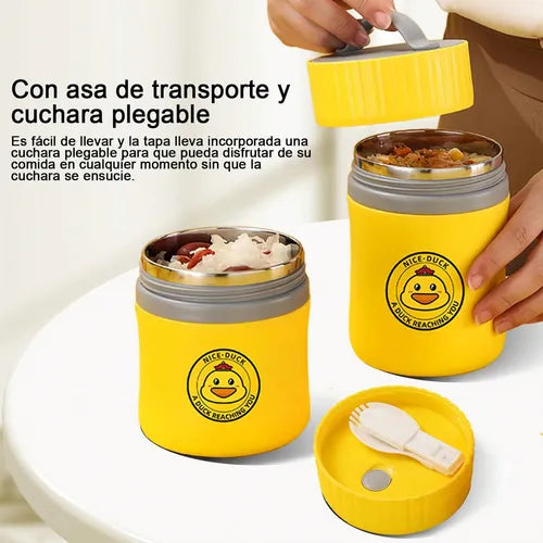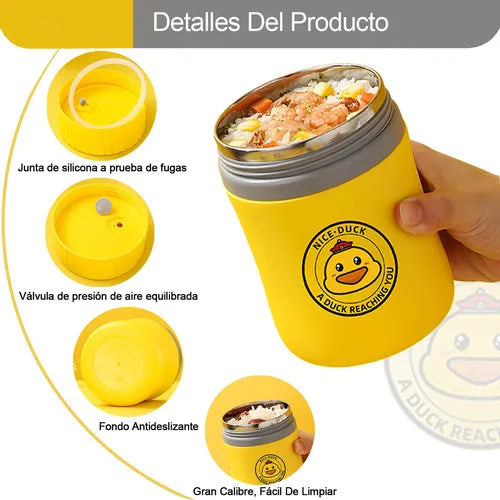 Esta lonchera térmica está diseñada con un patrón de dibujos animados de pato amarillo. Tiene una forma linda e interesante y es de tamaño pequeño, lo que lo hace muy adecuado para llevarlo cuando viaja. No es solo un práctico contenedor de aislamiento térmico, sino también un moderno accesorio para el hogar.